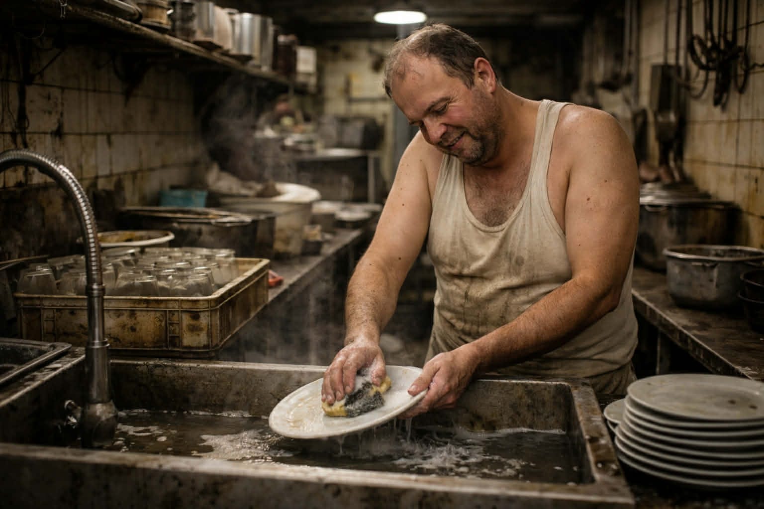Nimeni nu l-ar observa. Avem probleme să ne observăm unii pe alții, d-apoi un spălător de vase dintr-o bucătărie sordidă.