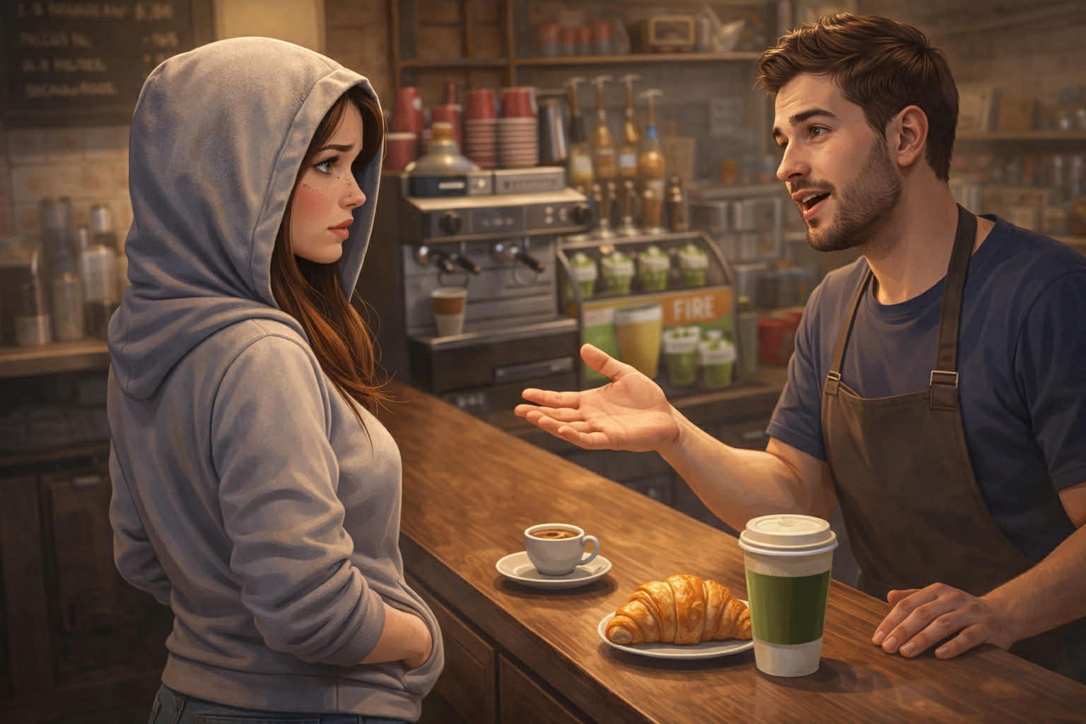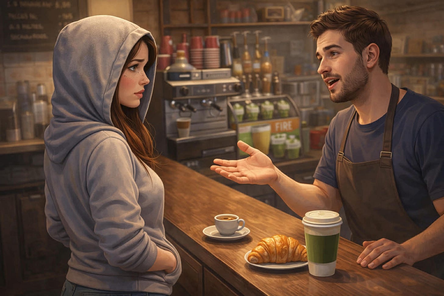 Barista: „Sure, dar știi că e tare, da? Femeile din ziua de azi preferă matcha. Eu îți dau espresso, deși e cam dur, mai manly așa, dar să știi că avem o ofertă fire la matcha, cu croissant, ca pentru o tipă cu rizz ca tine!”