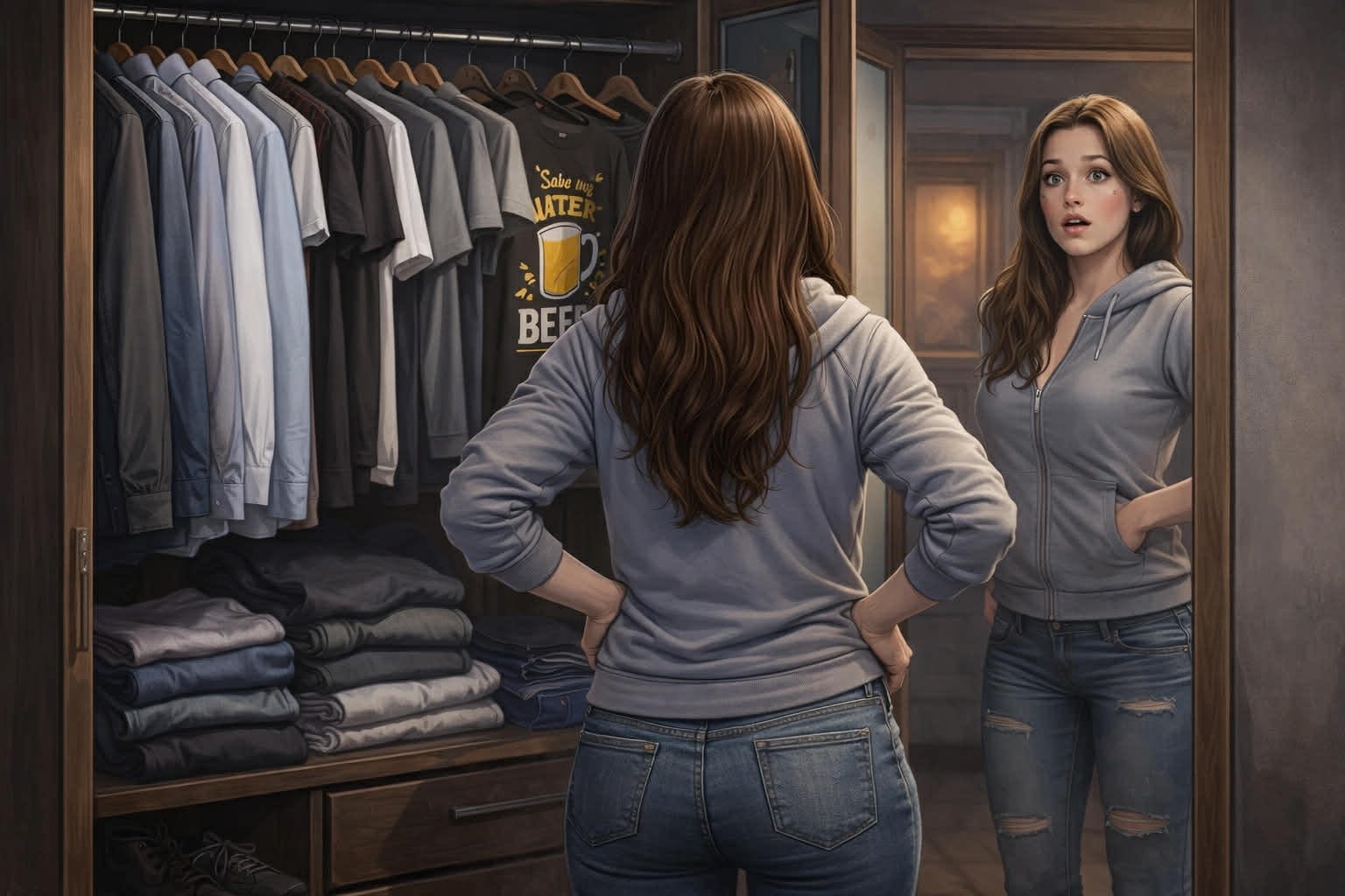Merge înapoi în dormitor, deschide dulapul și începe să se gândească la combinații. Ca o femeie veritabilă. Dulapul lui Marian conține câteva cămăși pentru job, tricouri albe, negre, gri, tricouri cu mesaje despre bere, blugi, hanorace.