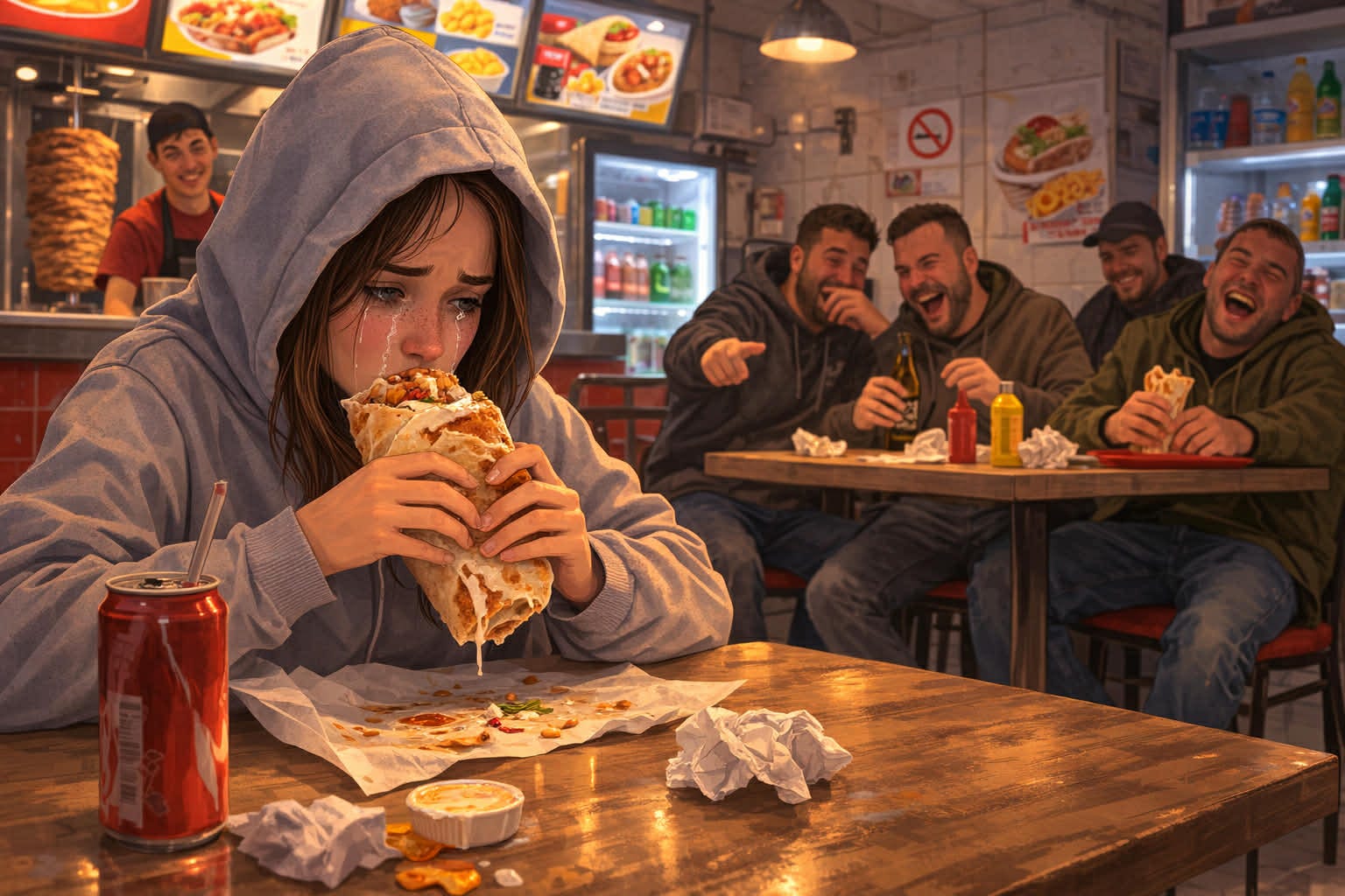 Un bărbat din shaormerie spune: „Dă-i una mică, boss, că după aia plânge!”